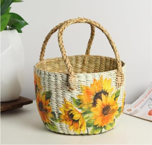 Crafted using natural fibers and materials. Designed for storage and decorative purposes.